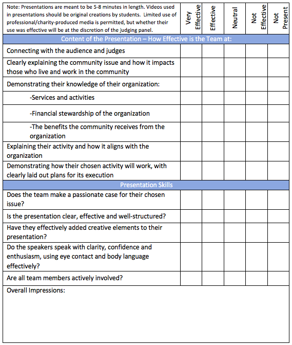 | Note: Presentations are meant to be 5-8 minutes in length. Videos used in presentations should be original creations by students. Limited use of professional/charity-produced media is permitted, but whether their use was effective will be at the discretion of the judging panel. | Very Effective |